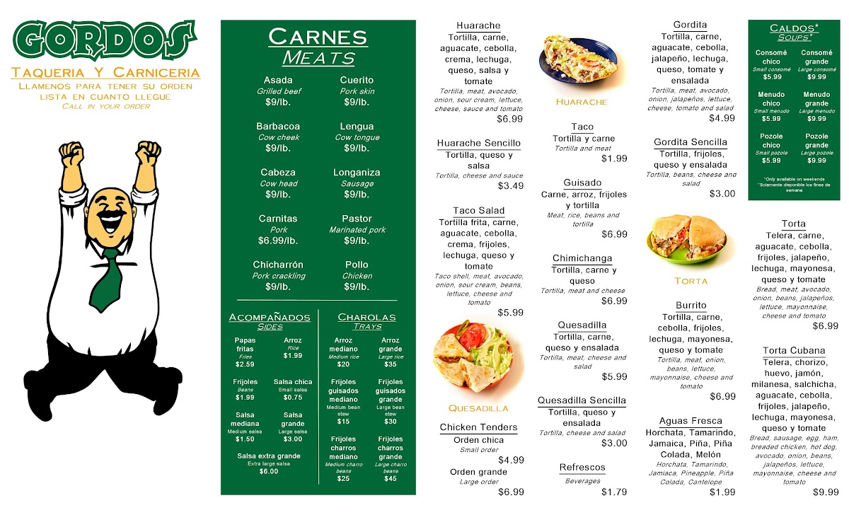 At Gordos in Pelham, Alabama, the menu offers a variety of rich and flavorful dishes that showcase traditional Mexican cuisine. The Caldos Soups are a great way to start your meal, featuring comforting options like Caldo de Consome and Caldo de Menudo, which promise warmth and heartiness with each spoonful. For those craving something unique, the Especiales Specials section includes the iconic Huarache and the mouthwatering Torta Cubana, both of which blend bold flavors and textures to create a satisfying experience.